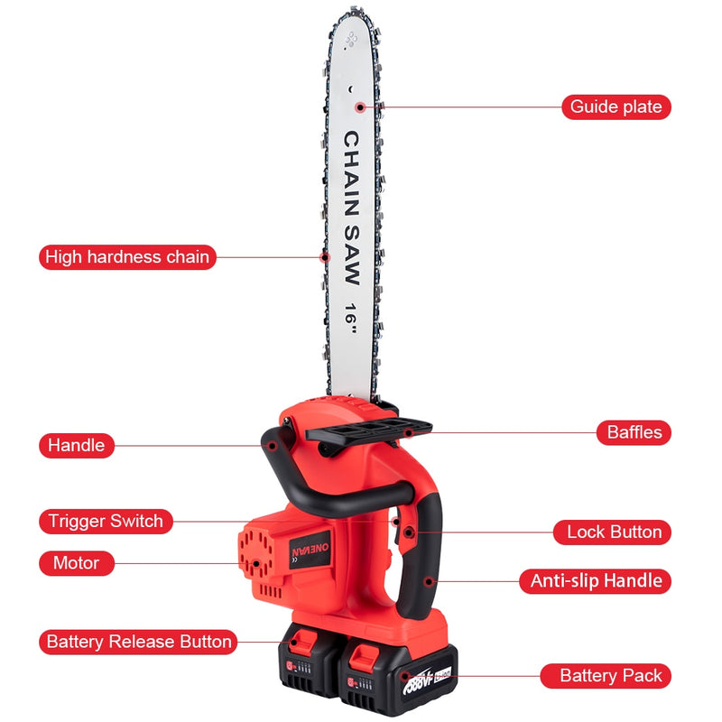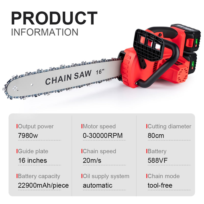 Características :● Ligação sem fio: corte fácil ao ar livre● Motor forte: 7900W, poder poderoso, longa vida útil de serviço● Design de manuseio: aderência confortável, de acordo com o design do corpo humano● energia da bateria de lítio: diga adeus ao trabalho de encontrar fonte de alimentação● Projeto de orifício...