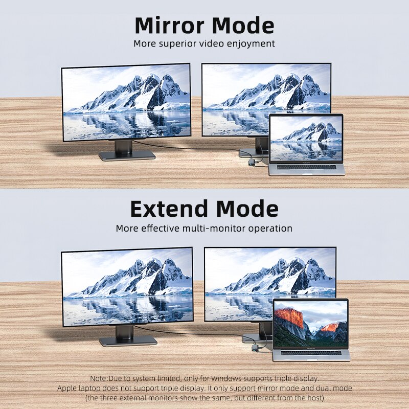 Devido ao sistema limitado, apenas para windows suporta exibição tripla. Apple portátil não suporta exibição tripla. Ele suporta apenas o modo de espelho e modo duplo (os três monitores externos mostram o mesmo, mas diferente do host).
